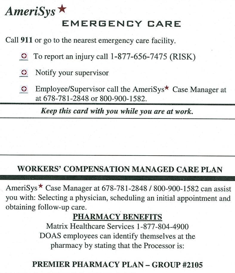 If you experienced a workers’ compensation injury or illness prior to the effective date of this managed care plan, you may continue treatment already in effect. An AmeriSys Nurse Case Manager will be assigned for continued coordination of care when needed, in accordance with the State Board of Worker’s Compensation Rule 208.