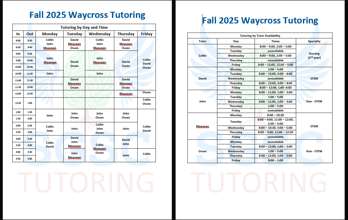 Peer Tutoring is available on both Douglas and Waycross campuses, as well as virtaully for students who are unable to join us on campus. We are open during normal business hours: 8am - 5pm, Monday - Friday. If you need help after hours, we have joined with Tutor.com to offer support after hours and on weekends.