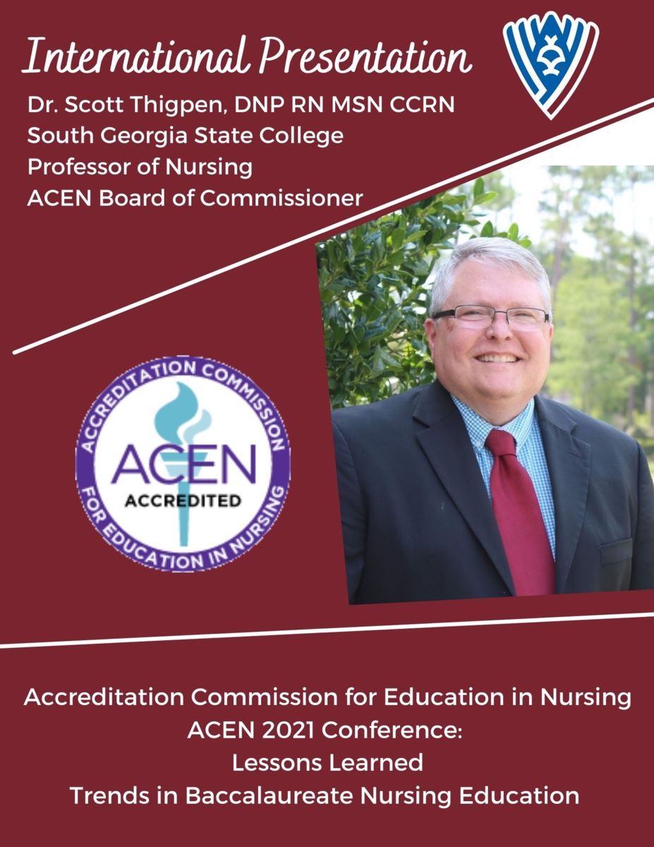 Congratulations to Dr. Scott Thigpen, SGSC’s Professor of Nursing and ACEN Board of Commissioner, for being selected for an international presentation at the Accreditation Commission for Education in Nursing 2021 Conference. His session will be Lessons Learned: Trends in Baccalaureate Nursing Education.