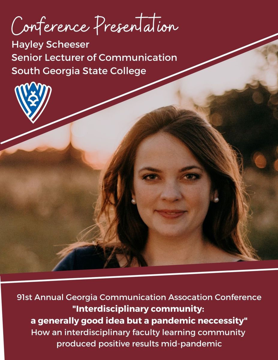 Congratulations to Hayley Scheeser, SGSC’s Senior Lecturer of Communication, for being selected to present at the 91st Annual Georgia Communication Association Conference. Her virtual session was entitled “Interdisciplinary community: a generally good idea but a pandemic necessity” and featured her thoughts on how an interdisciplinary faculty learning community produced positive results mid-pandemic.