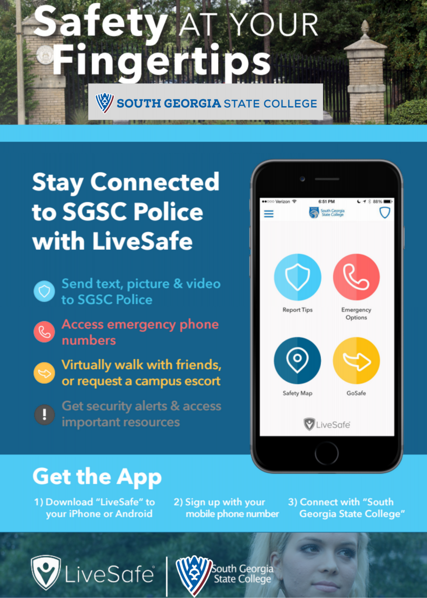 Live Safe is a personal mobile safety app that SGSC provides to students, staff, and faculty. Live Safe is a free download that provides a quick and convenient means of communication thereby enhancing overall safety.