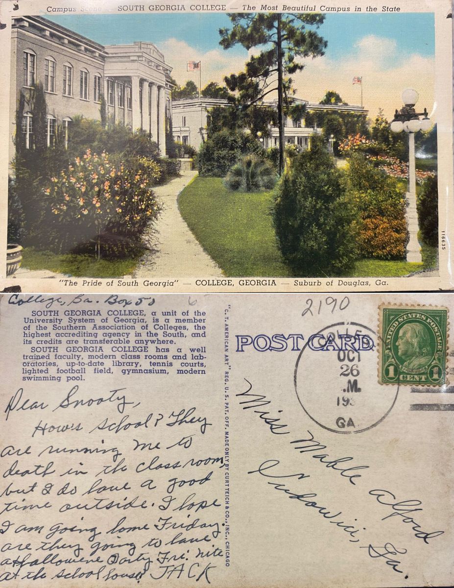 As Dr. Tanner was checking mail in his campus office, he came across one that was simply addressed to the President at South Georgia College, but what caught his eye was that it was sent from Stockton, California. As he opened the envelope and took out the folded letter, a postcard fell on his desk. The picture on the postcard was an early campus scene of South Georgia College with the words – “The Most Beautiful Campus in the State”, and “The Pride of South Georgia” in the “suburb of Douglas, Ga”. The postcard had been mailed with a one cent stamp in what appears to be the 1930’s. The message on the back from Jack to Miss Mable Alford in Ludowici, Ga., read, “Dear Snooty, How’s school? They are running me to death in the classroom, but I do love a good time outside. I hope I am going home Friday. Are they going to have a Halloween party Fri. nite at the school house?”