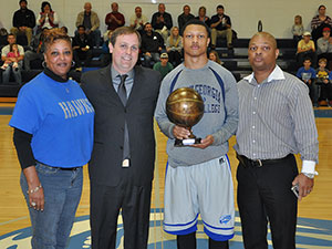 PHOTO: Jovante’ Spivey (second from right) was recognized February 11 for being the first player to eclipse 1,000 points in a career at SGSC. (L-R) Nicole Spivey (mother), SGSC head coach Cory Baldwin, Spivey, and Anthony Spivey (father).