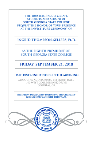South Georgia State College (SGSC) invites you to help celebrate the investiture ceremony of SGSC’s eighth president, Dr. Ingrid Thompson-Sellers, on Friday, September 21, 2018, at 9:30 a.m. in McGouirk Auditorium inside Peterson Hall on the Douglas Campus.