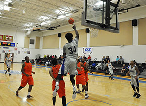PHOTO: Demontrez Austin tries for a dunk Tuesday night against Brewton-Parker College’s junior varsity team.