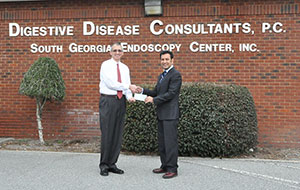 Sohail A. Choudhri, M.D. (right) of Digestive Disease Consultants, P.C. of Waycross recently made a contribution on behalf of the practice to the James M. Dye Foundation on South Georgia State College’s Waycross Campus. Accepting the check was Foundation Executive Director Taylor Hereford. The Dye Foundation is grateful to Digestive Disease Consultants, P.C. for its continued support. Contributions to the Dye Foundation are tax-deductible and help the Foundation provide much-needed funding to Waycross Campus faculty, staff, and students through various initiatives. For more information or to make a contribution to the James M. Dye Foundation, please call (912) 449-7510.