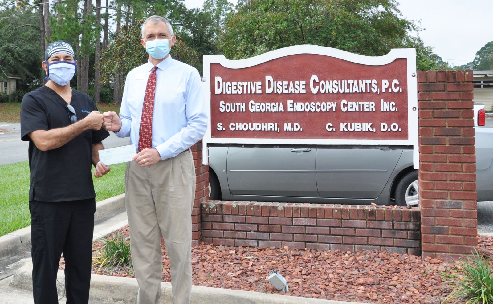 Dr. Sohail Choudhri (left) of Digestive Disease Consultants recently made a contribution on behalf of the practice to the James M. Dye Foundation’s Excellence Fund. Accepting the check on behalf of the Foundation was Executive Director Taylor Hereford. The Dye Foundation’s Excellence Fund supports programs and initiatives not funded by state appropriations on South Georgia State College’s Waycross Campus and college wide. Digestive Disease Consultants has supported the Foundation’s Excellence Fund for many years, and the Foundation is grateful for the continued partnership. The James M. Dye Foundation is a 501(c)3 non-profit cooperative organization of South Georgia State College. Contributions to the Foundation are tax-deductible as allowed by law. For more information about the Foundation or to make a donation, contact Hereford at (912) 449-7510 or taylor.hereford@sgsc.edu.