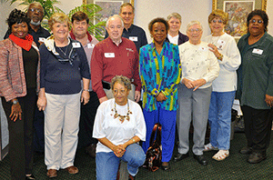 BOTTOM PHOTO: Dr. Mary Estes (third from right) returned to Waycross in 2012 for a reunion of charter faculty and staff of the former Waycross Junior College. (Kneeling) Bettye White; front row (L-R): Mary Lee-Green, Dr. Angie Davis, Bill Deason, Rita Taylor Godwin, Estes, Dr. Charlotte Crittenden and Ella Marie Washington; back row (L-R): James White, Parker Davis, Dr. Jim Helms, and Dr. Brenda Armbrecht.