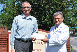 Marco Ayulo, M.D. (right) of Oncology Hematology Care Center in Waycross recently made a contribution on behalf of his practice to the James M. Dye Foundation to support the faculty, staff, and students on South Georgia State College’s (SGSC) Waycross Campus. Executive Director Taylor Hereford accepted the contribution on behalf of the Foundation. Ayulo and his staff have supported the Foundation’s mission for many years, and Hereford said he was grateful for Ayulo’s continued support. The Dye Foundation supports various initiatives on SGSC’s Waycross Campus, including student scholarships and grants, which are not funded by the State of Georgia. All contributions to the Dye Foundation are tax-deductible to the extent of the law. For more information about the Dye Foundation or to make a contribution, please call 912.449.7510 or email taylor.hereford@sgsc.edu.