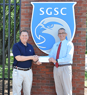 James Willis (left), area manager for Georgia Power Company in Waycross, recently presented a contribution to the James M. Dye Foundation’s FY 2019 Annual Giving Campaign, which began July 1. Accepting the check was Foundation Executive Director Taylor Hereford. Georgia Power has a long and rich history of engagement and support for education in Georgia. Dramatically improving public education and workforce preparedness are key initiatives for the company. The Dye Foundation provides funding for various initiatives on South Georgia State College’s Waycross Campus, outside of state appropriations, including student scholarships and grants, campus events, and programs. Georgia Power has supported the Dye Foundation’s work for many years, and the Foundation is grateful for the company’s continued educational partnership. All contributions to the Foundation are tax deductible to the extent of the law. For more information about the Foundation or to make a donation, please call 912.449.7510 or email taylor.hereford@sgsc.edu.