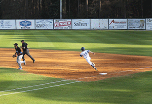 BOTTOM PHOTO: Chase Hinson rounds first base against Tallahassee Community College.
