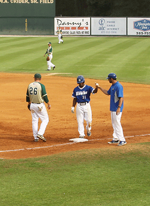PHOTO: SGSC assistant baseball coach Jaime Dennis congratulates Stephan Cruver on his hit against East Georgia.