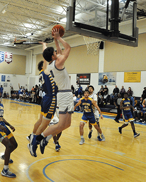 PHOTO: Will Ferguson drives for two of his 15 points in the GCAA Tournament quarterfinal game against Gordon State.