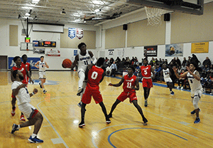 PHOTO: Marquise Jackson leads a fast break Tuesday night against Core4 Academy.