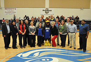 BOTTOM PHOTO: Members of the Waycross-Ware County Chamber of Commerce were recognized at halftime Wednesday night as part of Chamber Night at SGSC.