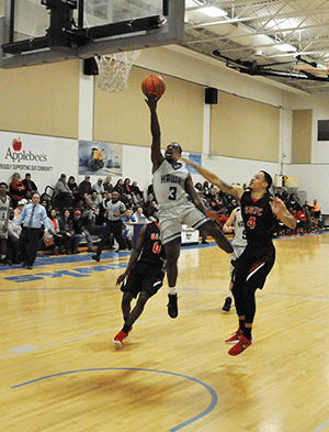 TOP PHOTO: Karim Mawuenyega scores two of his 10 points Wednesday night against South Georgia Tech.