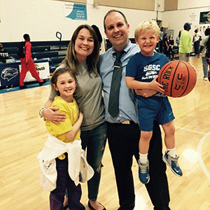 PHOTO: SGSC head basketball coach Cory Baldwin celebrates the Hawks’ GCAA quarterfinal win over South Georgia Tech Tuesday night with his family (L-R) daughter J. Marie, wife Amanda, and son Logan. Tuesday night’s win was also Baldwin’s 200th in his 10-year career coaching NJCAA basketball.