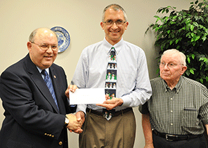 PHOTO: Franklin Rozier (left) of the Okefenokee Chapter of MOAA, recently presented a significant contribution for the MOAA Scholarship to Taylor Hereford, executive director of the James M. Dye Foundation. Charles Blount (right), a member of MOAA, also attended the presentation.