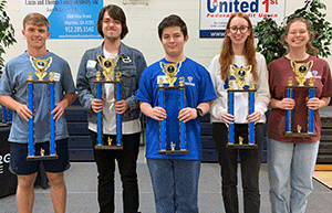 Individual winners in the South Georgia State College High School Mathematics Tournament were (L-R) Luke Carter (first place; Brantley), Noah Cook (second place; Ware), Cody Page (third place; Ware), Addy Cantrell (fourth place; Pierce), and Cadee Raulerson (fifth place; Pierce).