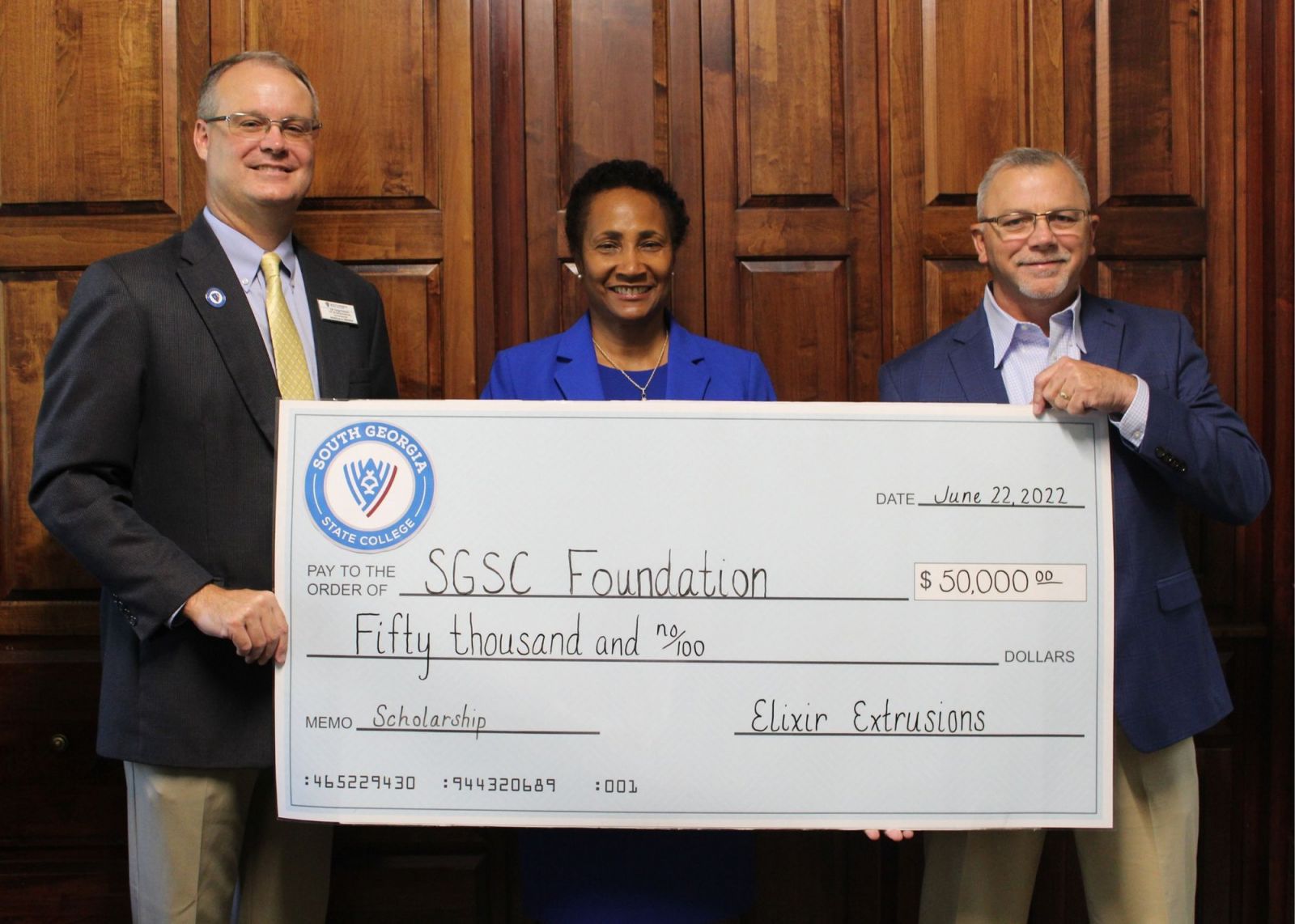 Dr. Greg Tanner, SGSC Vice President for Advancement, Government Relations and Athletics and Dr. Ingrid Thompson-Sellers, SGSC President receive a donation from Mr. Philip Smith, President of Elixir Extrusion for the Bachelor of Science in Mechanical Engineering Technology program at SGSC.