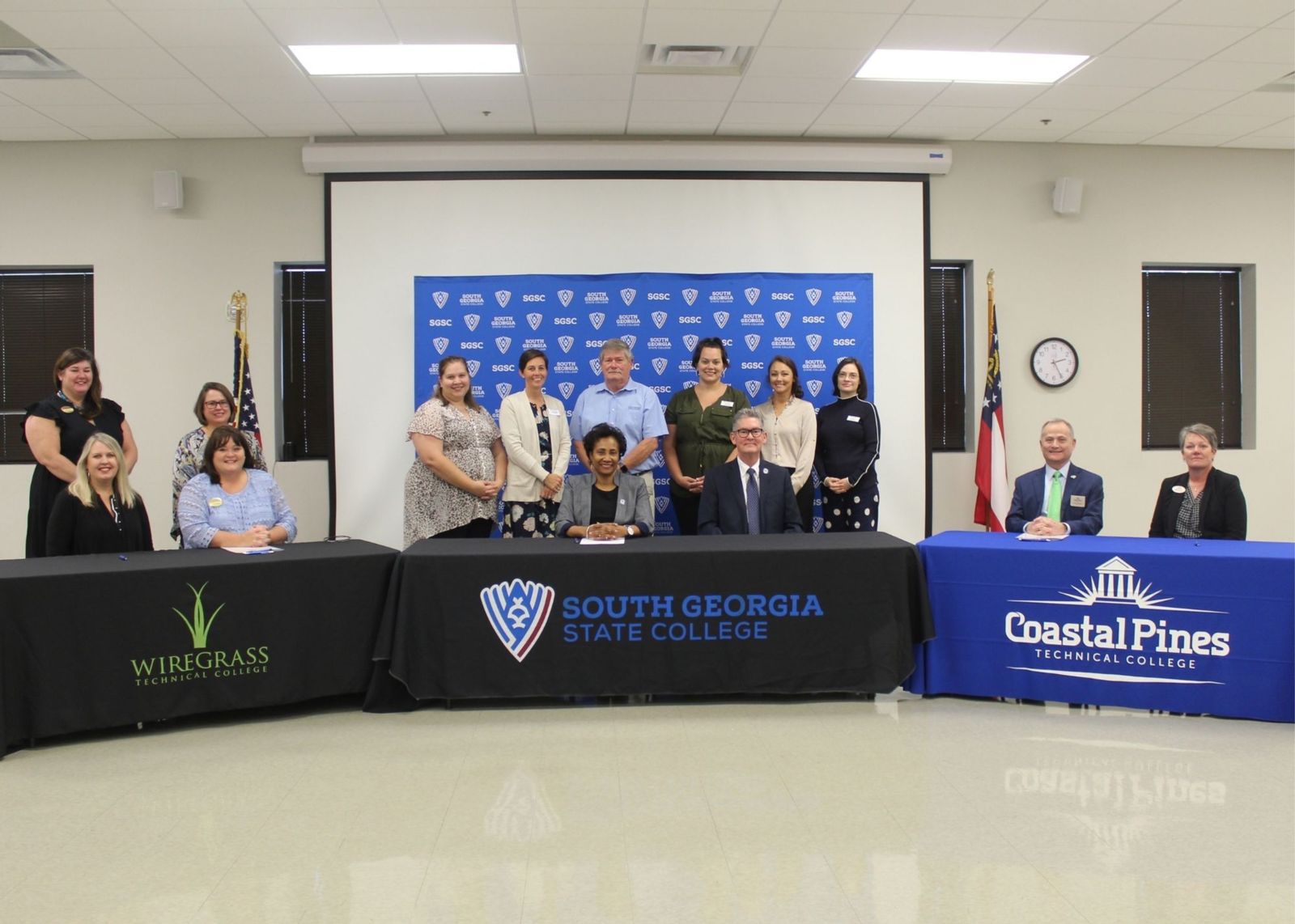 Participating in the ceremony from Wiregrass Georgia Technical College were (seated) Ms. April McDuffie, Interim Vice President for Academic Affairs, and Ms. DeAnnia Clements, Interim President; and (standing) Ms. Niki Y. Ogletree, Executive Director for Academic Affairs, and Ms. Holly Greene, Dean of Academic Affairs. Representing South Georgia State College were (seated) Dr. Ingrid Thompson-Sellers, President, and Dr. Robert Page, Vice President of Academic and Student Affairs and (standing) Ms. Niki Hersey, Assistant Professor ELE/SPED Program, Ms. Amy Fitzgerald, Assistant Professor ELE/SPED Program, Dr. Kit Carson, Chair and Professor of Education, ELE/SPED Program, Ms. Silvanna Corona, Administrative Assistant, ELE/SPED Program. Dr. Zena Lloyd, Assistant Professor ELE/SPED Program, and Dr. Jodi Fissel, Dean, Arts and Professional Studies. Mr. Lonnie Roberts, President, and Ms. Amanda Morris, Executive Vice President and Vice President for Academic Affairs, attended on behalf of Coastal Pines Technical College.