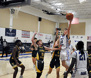TOP PHOTO: Andrew Prestwood drives for two of his eight points Saturday afternoon against Florida Gateway College.