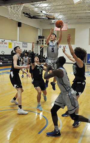 PHOTO: Luke Lawson drives for two points Saturday afternoon against State College of Florida, Manatee-Sarasota