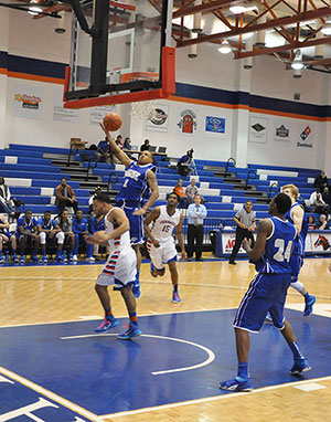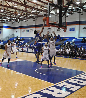 TOP PHOTO: Tyrone Sam drives for a basket Saturday afternoon against Georgia Highlands.