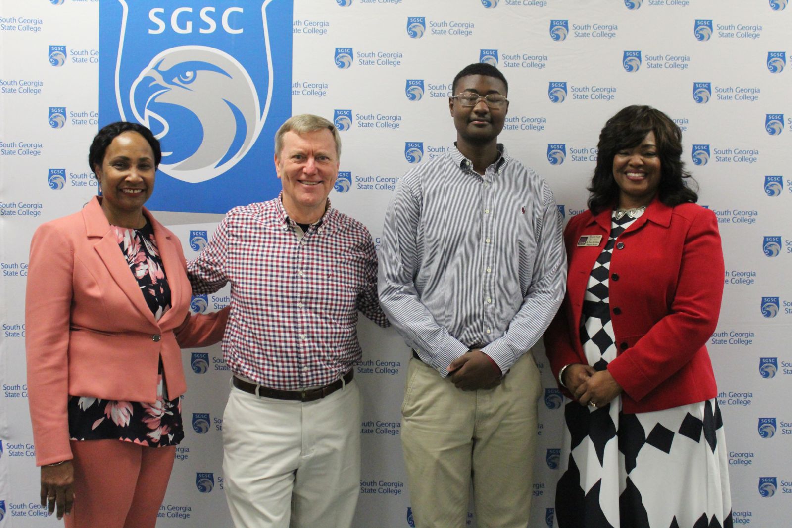 L to R: Dr. Ingrid Thompson-Sellers, SGSC President; Dr. Jim Cottingham, SGSC Foundation Trustee; Mr. Ernest Wesley, scholarship recipient; and Dr. Tracy McClelland, SGSC Foundation President