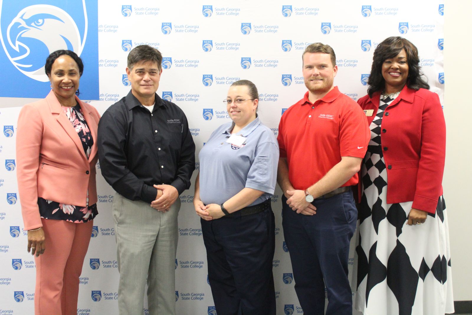 L to R: Dr. Ingrid Thompson-Sellers, SGSC President; Mr. Romeo Reyes, Satilla REMC President/CEO; Ms. April Simmons Burkett, scholarship recipient; Mr. Matt Parker, Satilla REMC Public Relations Coordinator; and Dr. Tracy McClelland, SGSC Foundation President