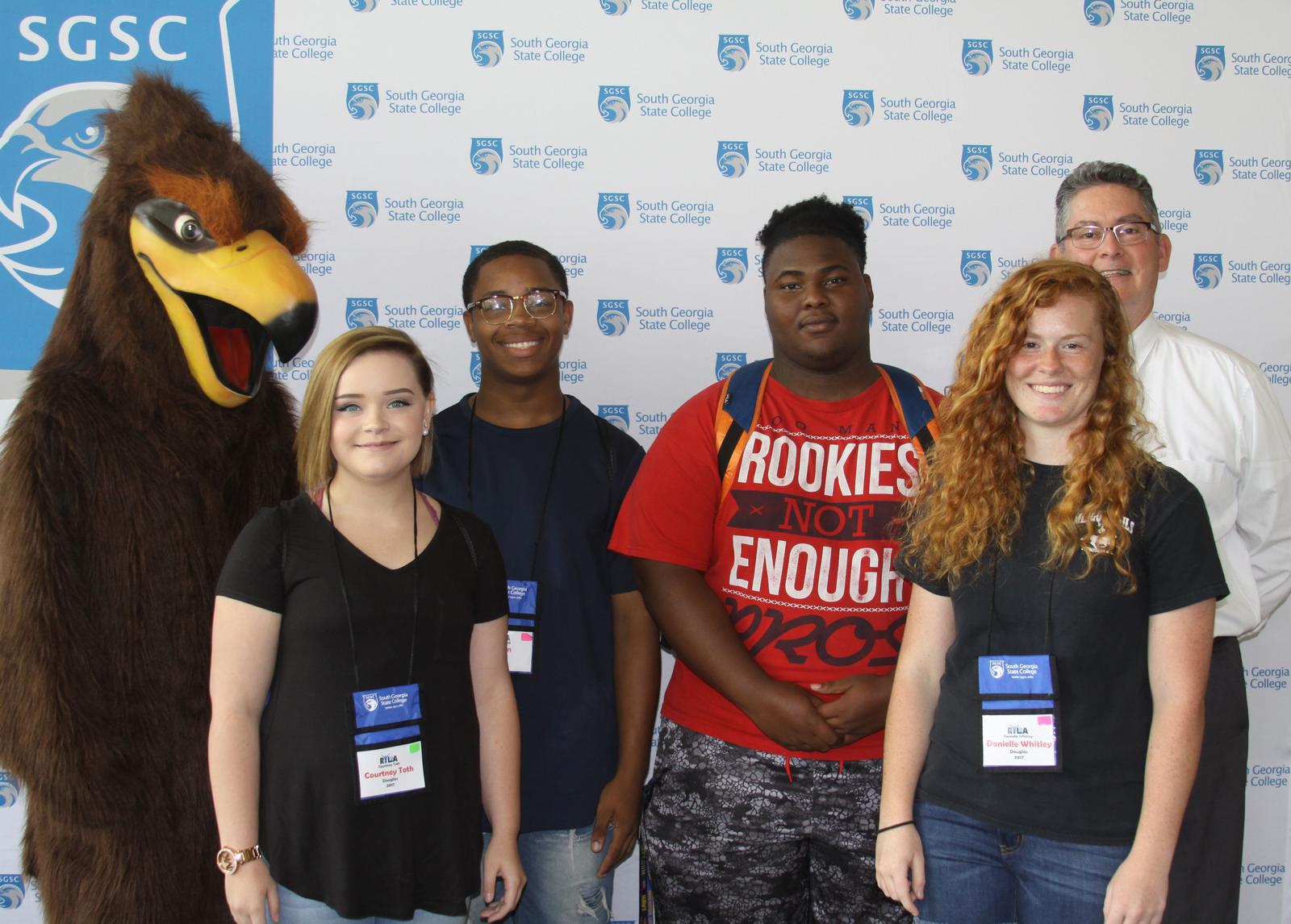 Attendees sponsored by the Douglas Rotary Club were Courtney Toth, Jaylen Wynn, Malech Ryals, and Danielle Whitley. They are pictured with Dr. Rob Page, Vice President for Academic and Student Success and the SGSC Hawk.