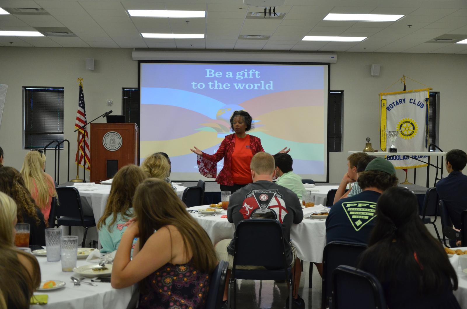 | Ms. Andrea Giggetts, owner of Giggetts and Associates, speaks to the RYLA students at Sunday morning's farewell brunch. |
