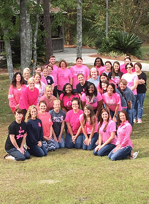 Second-year nursing students on South Georgia State College’s (SGSC) Waycross Campus recently showed their support for Breast Cancer Awareness Month by wearing pink and forming a breast cancer awareness ribbon between classes. Lauren Thornton, assistant professor of nursing, said the activity was in conjunction with recent lectures on breast cancer, and all of the students wanted to show their support for the cause. “The students participated on their own with no grade attached,” said Thornton. “This is a really good group of students, and our School of Nursing is compassionate toward those who have suffered, or are currently suffering, from breast cancer.” For more information about SGSC’s School of Nursing, please call (912) 260-4356.