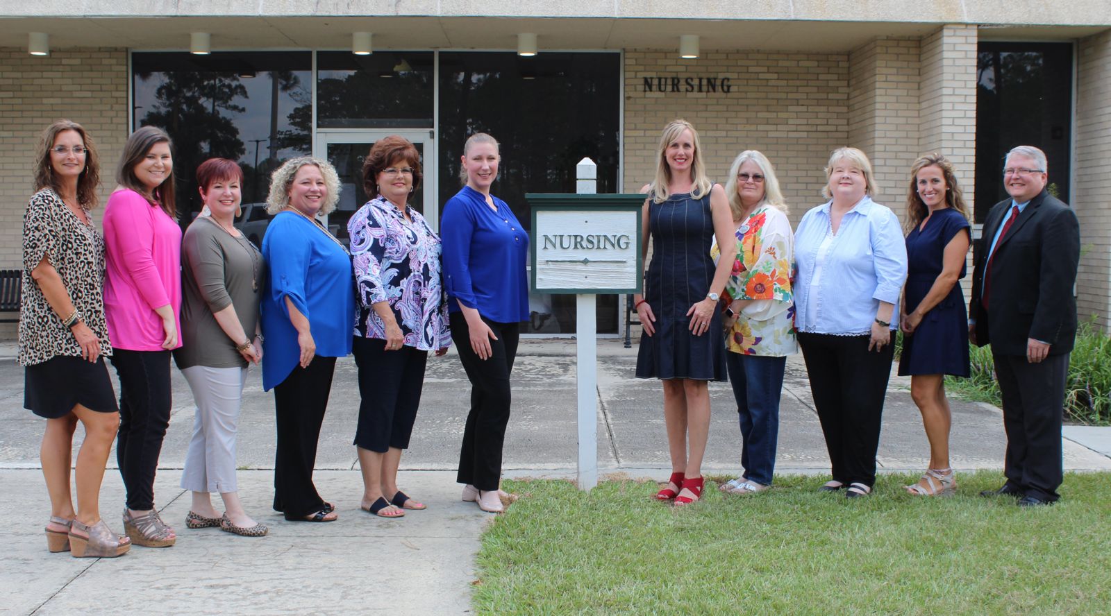 Faculty and staff in SGSC’s School of Nursing (L to R) Kasey Strickland, associate professor of nursing; Melaina Nall, academic advisor; Tonya Jewell, assistant professor of nursing; Dr. Jaime Carter, dean and professor of nursing; Shanda Jowers, assistant professor of nursing; Kim Sutliff, administrative assistant; Lisa Batten, associate professor of nursing; Dr. Susan Clement, interim chair of nursing and health science, associate professor of nursing; Darlene Pirkle, assistant professor of nursing; Lauren Thornton, assistant professor of nursing; and Dr. Scott Thigpen, professor of nursing.