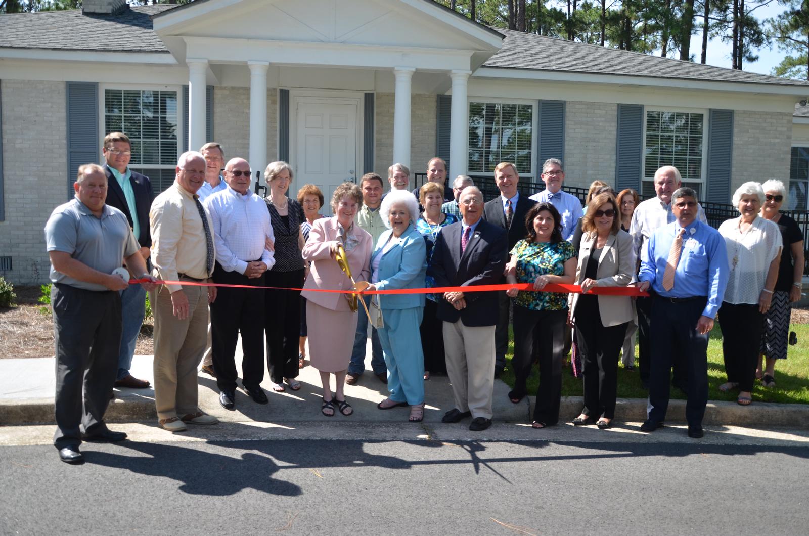 | SGSC President Dr. Virginia Carson (center) cuts the ribbon on the newly-renovated Alumni House |