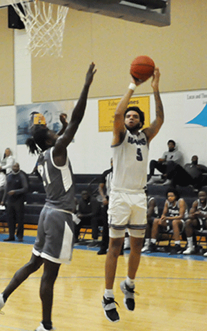 PHOTO: Bryce Brown (#5) has been named the GCAA’s Division I Men’s Basketball Player of the Week.