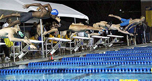 BOTTOM PHOTO: SGSC swimmer Amir Munjaii begins his race at the NJCAA Swimming and Diving Championships.