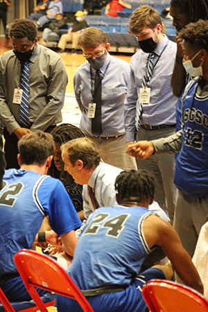PHOTO: Head coach Cory Baldwin talks with his team during a timeout Monday night in the first round of the NJCAA Division I Men’s Basketball Tournament.