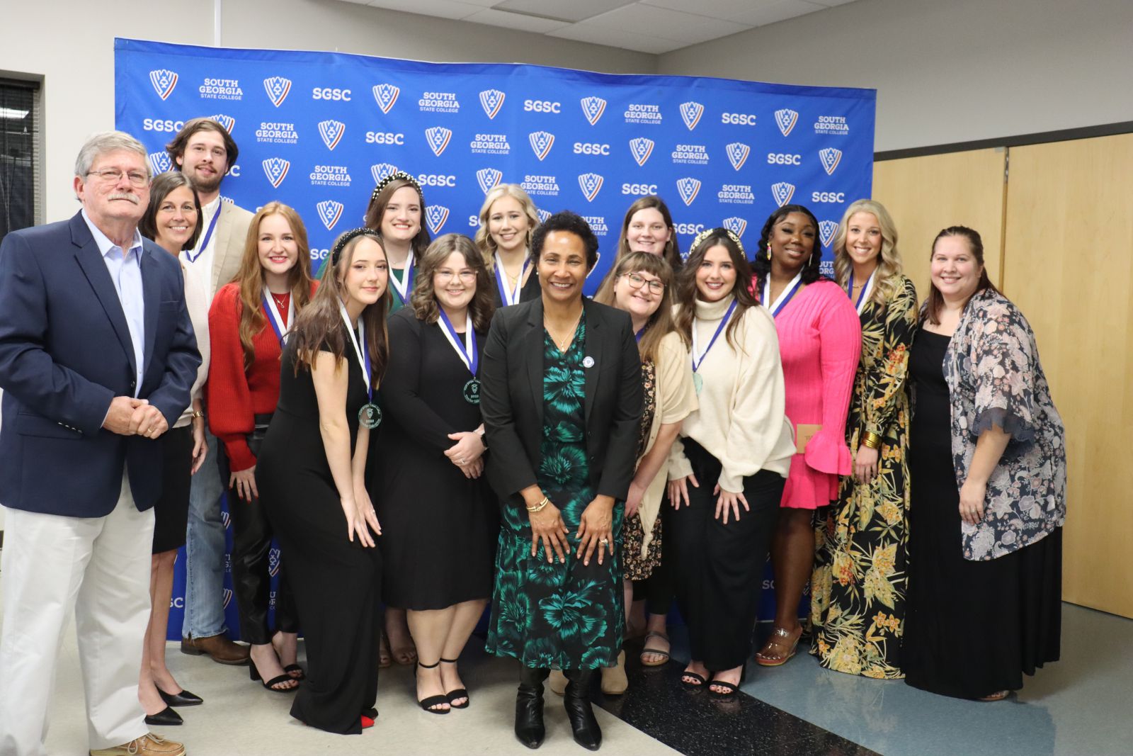 Dr. Kit Carson, chair of teacher education program; Amy Fitzgerald, assistant professor of education and field placement supervisor; Adam Solomon (Douglas, GA); Jordan Smith (Adel, GA); Autumn McLoughlin (Wray, GA); Hannah Pridgen (Douglas, GA); Alexis Spangler (Douglas, GA); Hope Lewis (Alma, GA); Dr. Ingrid Thompson-Sellers, SGSC president; Nicole Rigdon (Hazlehurst, GA); Cassandra Osorio (Uvalda, GA); Elizabeth Merritt (Douglas, GA); Samaria Wright (Douglas, GA); Marlee Colson (Hazlehurst, GA); and Niki Hersey, assistant professor of education and field placement supervisor.