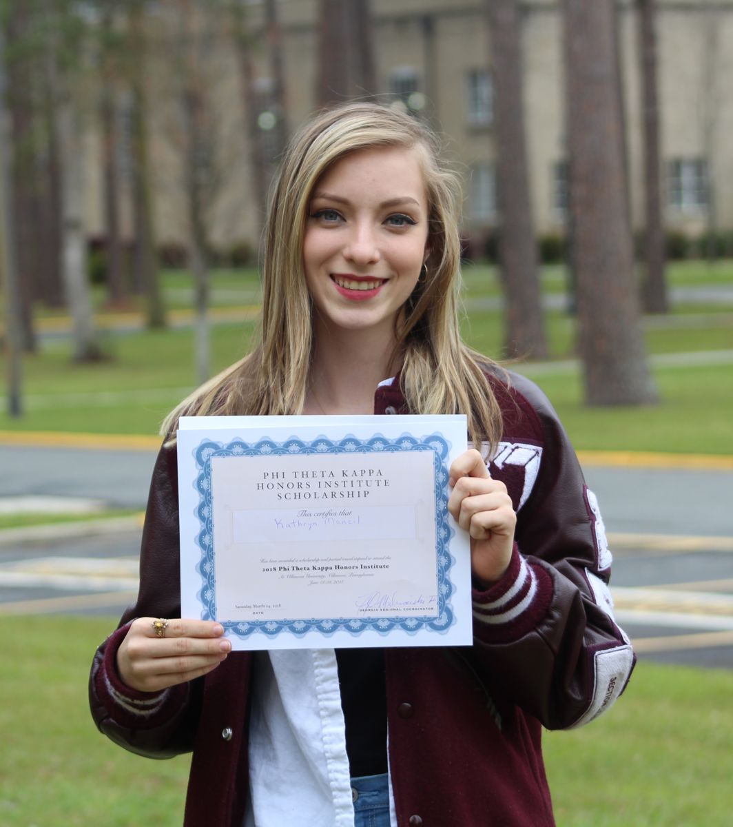 Kathryn Mancil was selected to receive the student scholarship to attend Honors Institute at Villanova University in Pennsylvania this summer. The scholarship covers the registration fee, lodging, and meals. Honors Institute is known as the crown jewel of Phi Theta Kappa programming and will include guest speakers and training for advisors, members, and regional officers. Kathryn is a dual enrollment student from Coffee High studying early childhood education at SGSC. In her application essay, Kathryn stated, “By attending the Honors Institute, I will be allowed to further grow as a young adult and future teacher with an open mind to the changing world around me.”