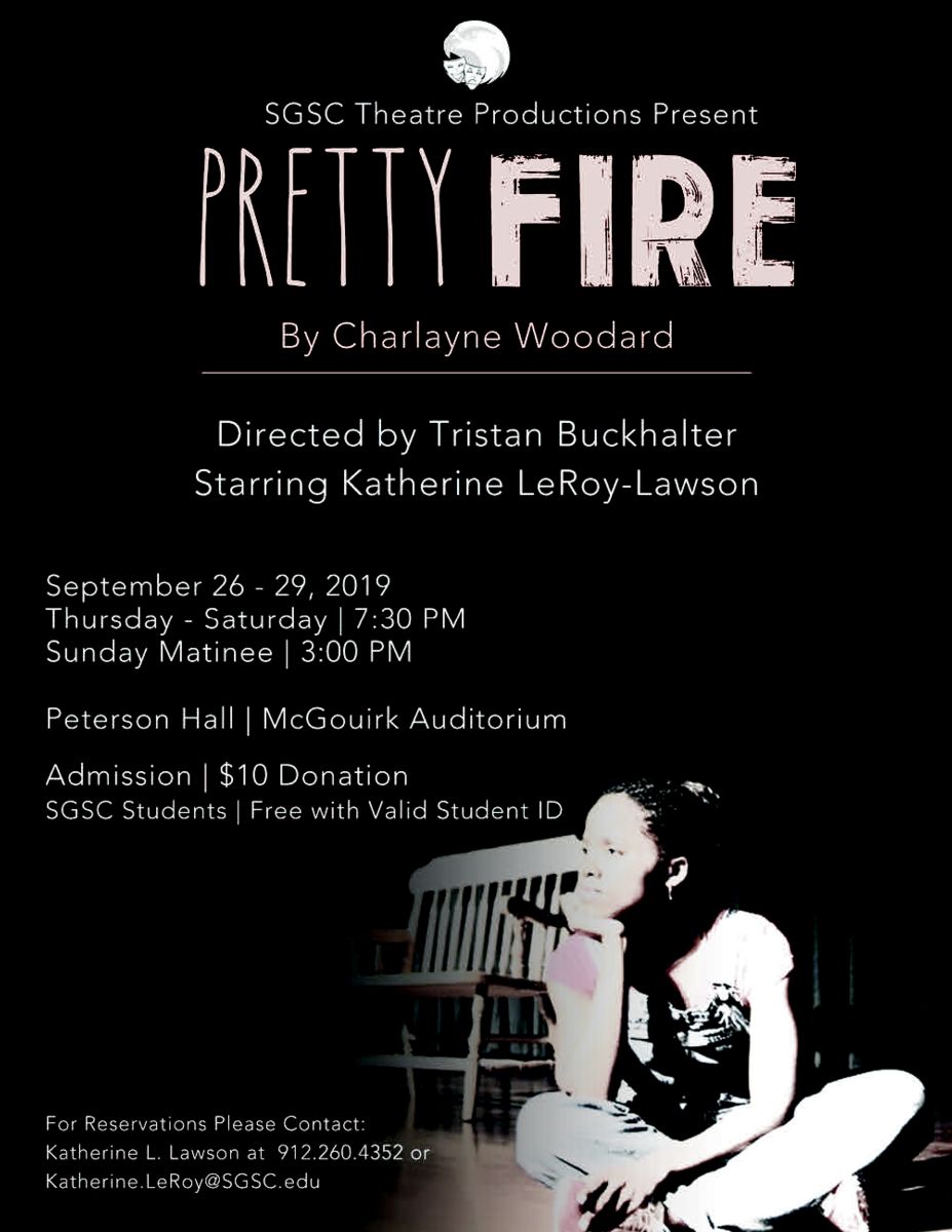 South Georgia State College (SGSC) Theatre Productions is thrilled to announce its upcoming production of Charlayne Woodard’s Pretty Fire. This special event will be held on the evenings of September 26th, 27th and 28th at 7:30 pm, with a matinee performance on September 29th at 3:00 pm in Peterson Hall’s McGouirk Auditorium on the campus of South Georgia State College.