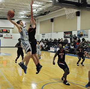 PHOTO: Riley Meloncon drives to the basket Saturday afternoon against South Georgia Tech.