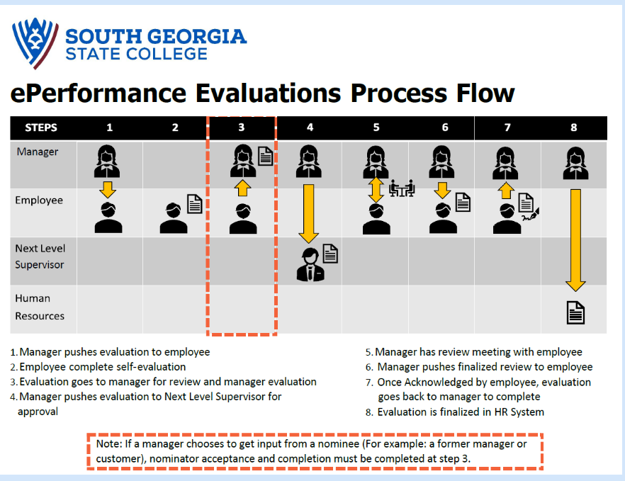 While performance management is an ongoing process, all full-time South Georgia State College staff will be evaluated annually on their work performance. Performance evaluations should be used for supervisors and employees to further communicate about performance, as well as set goals, expectations and development opportunities for the coming year.