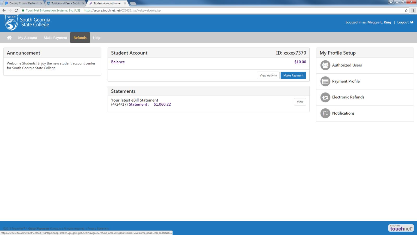 Students may have their excess funds electronically disbursed to the checking or savings account of their choice. To exercise this option, students may log into their Touchnet account and designate the account. For students who choose not to exercise this option, a paper check will be mailed to the address on file in the student’s self-service Banner account.