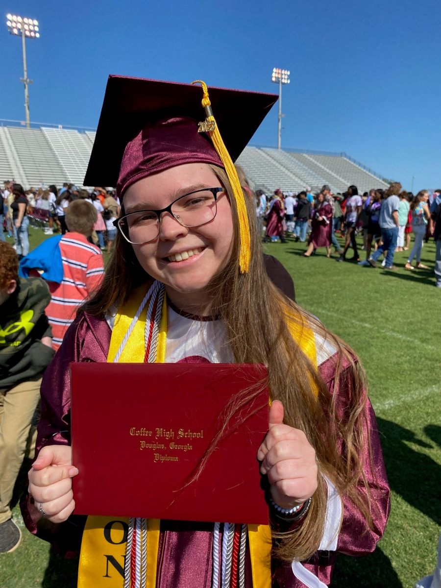 She graduated from Coffee High School with Honors, and she was ranked in the top 20 of her class. During high school, she participated in FCCLA and competed in STAR Events throughout high school. During her junior year, she participated in the STEAM Internship Program at Chick-fil-A Douglas, where she continues to work, assisting with community events and serving with a smile and a “My Pleasure.”