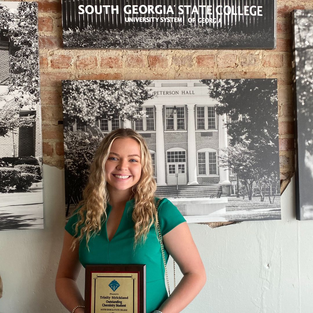 Trinity is pursuing a degree in SGSC’s Bachelor of Science in Biological Sciences program. She is Vice President of Pre-Med Club, senator of SGSC's Student Government Association, Vice President of Phi Theta Kappa Honor Society's Kappa Sigma chapter and member of the Outdoors Club. She has been awarded the Junior and Senior Academic Award along with the OPTIMA-Chemistry Award for her excellence in class and for obtaining a 4.0 GPA. She recently was honored with the 2023 Academic Recognition Day Award by the Board of Regents of the University System of Georgia.